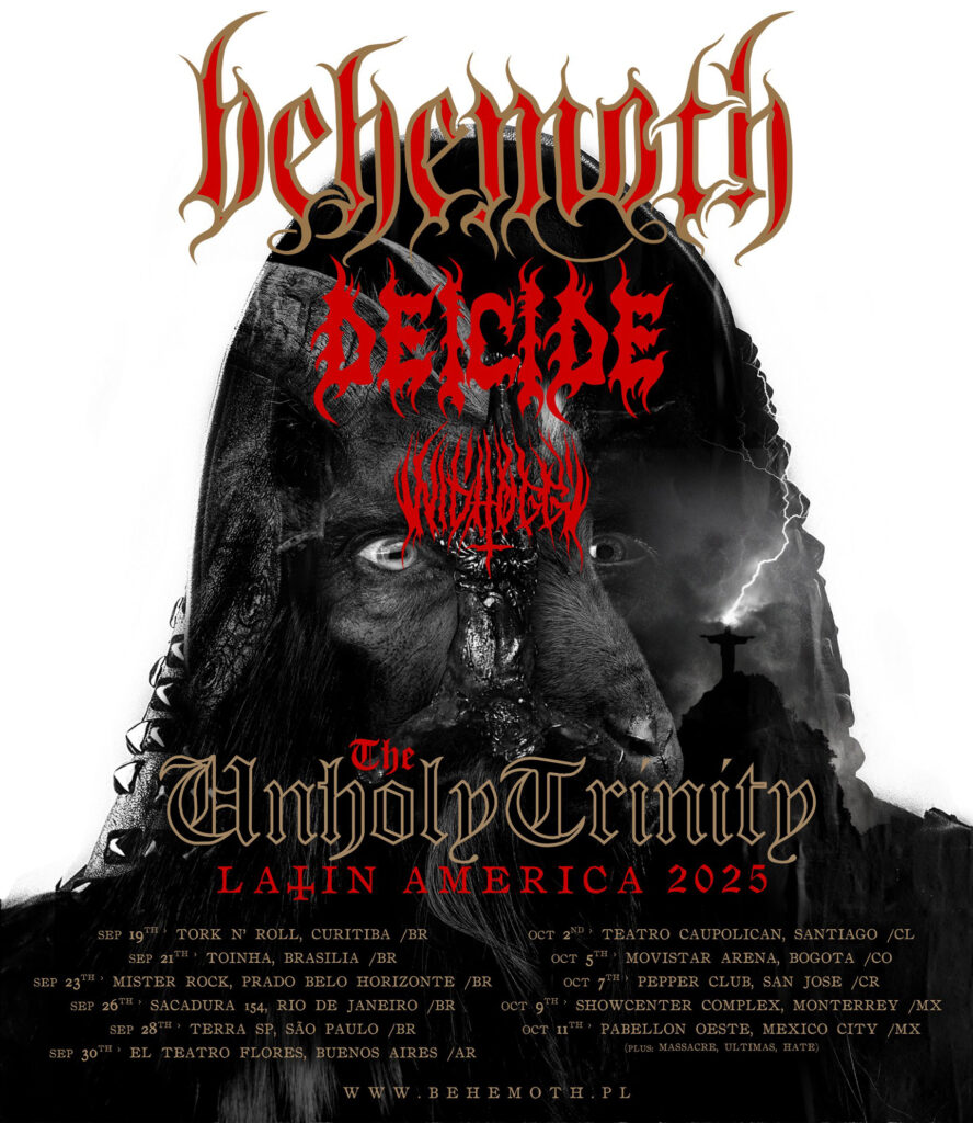 Los reyes polacos del metal extremo, Behemoth, traerán su gira “The Unholy Trinity” a México y Latinoamérica en 2025, en donde estarán acompañados por Deicide y Nidhogg, durante 11 fechas a lo largo de 6 paises: Brasil (x5), Argentina, Chile, Colombia, Costa Rica y México (x2).