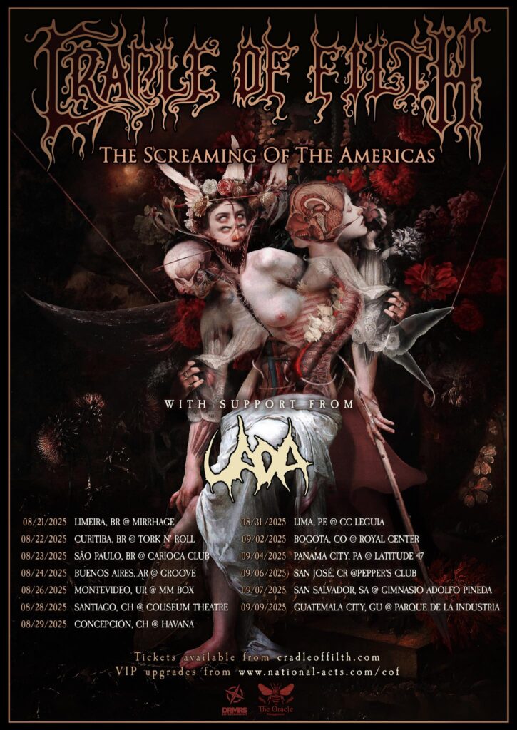 La legendaria banda británica de Extreme Gothic Metal, Cradle of Filth, ha confirmado una nueva gira por Sudamérica para el segundo semestre de 2025. Con un total de 15 conciertos en 10 países, la agrupación liderada por Dani Filth promete presentar sus nuevas canciones ante miles de fanáticos que han esperado por años el retorno del grupo a tierras latinas.